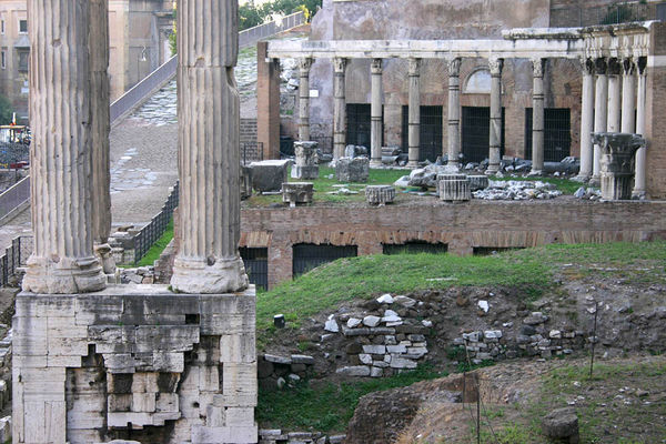 The columned portico in the background of the photo above is located in the Roman Forum. Six pairs of golden statues representing the principal Greek and Roman gods, male and female, were displayed in the large rectangular shrines behind the portico. It is called the ‘Portico of the Harmonious Gods’. Disharmonious may have been a better word.